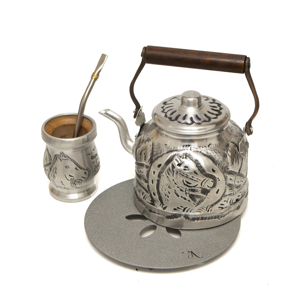 ¡Descubre nuestro exclusivo conjunto de aluminio cincelado a mano! Este elegante set incluye una pava, un mate con bombilla de regalo y un posa pava, todos diseñados para brindar una experiencia única en tu ritual de mate.